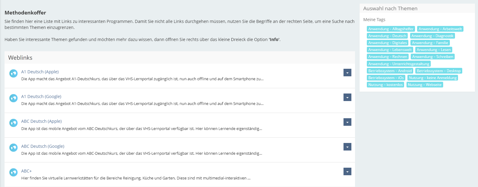 Über den DIGIalpha-Methodenkoffer, der Ihnen einen Überblick über empfehlenswerte Apps, Programme, Webseiten etc. bietet, bekommen Sie Lehr-/Lernmittel an die Hand.